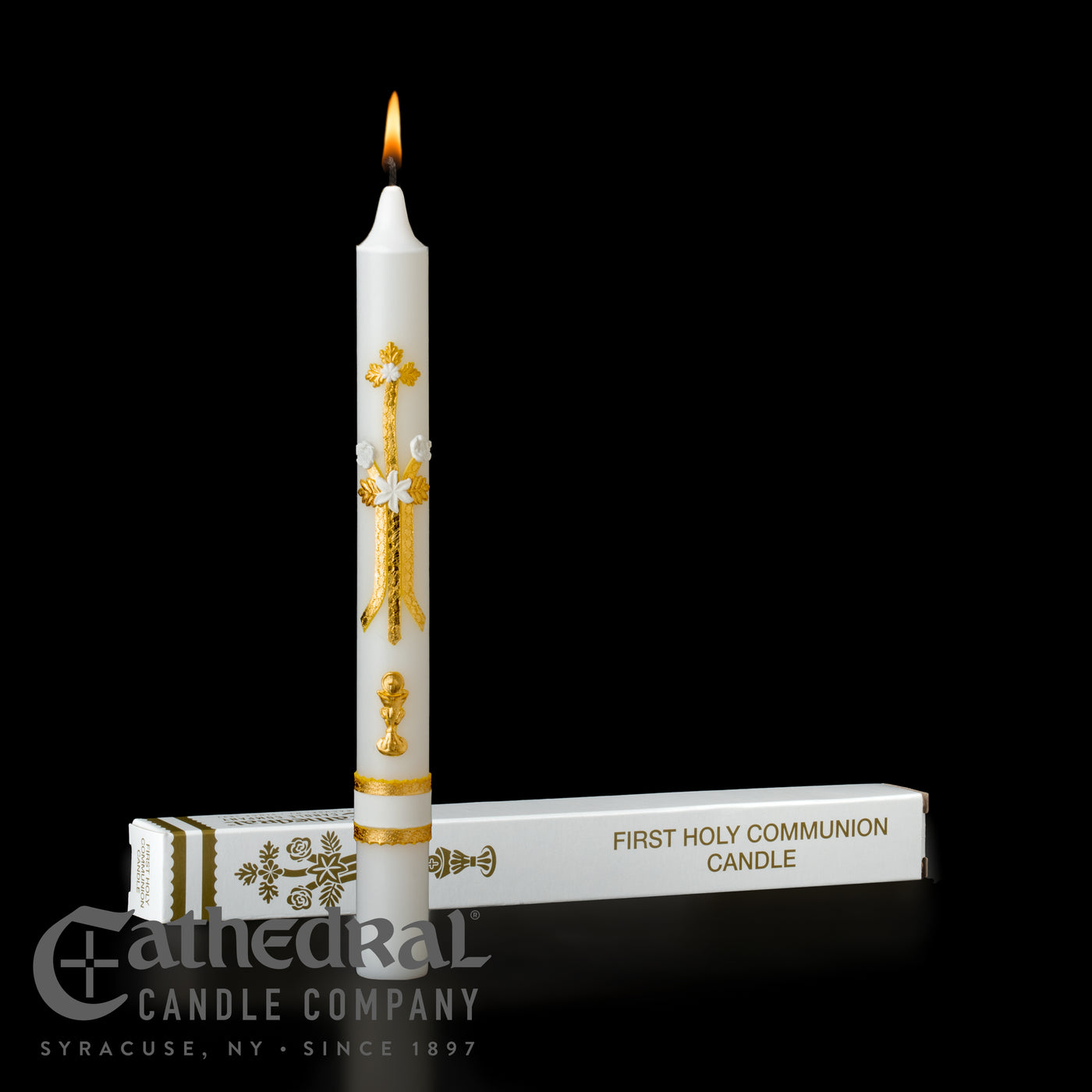 The gold leaf symbols of the sacrament adorn this white stearine candle. Individually boxed with provision for record keeping. 7/8" x 9-1/2".